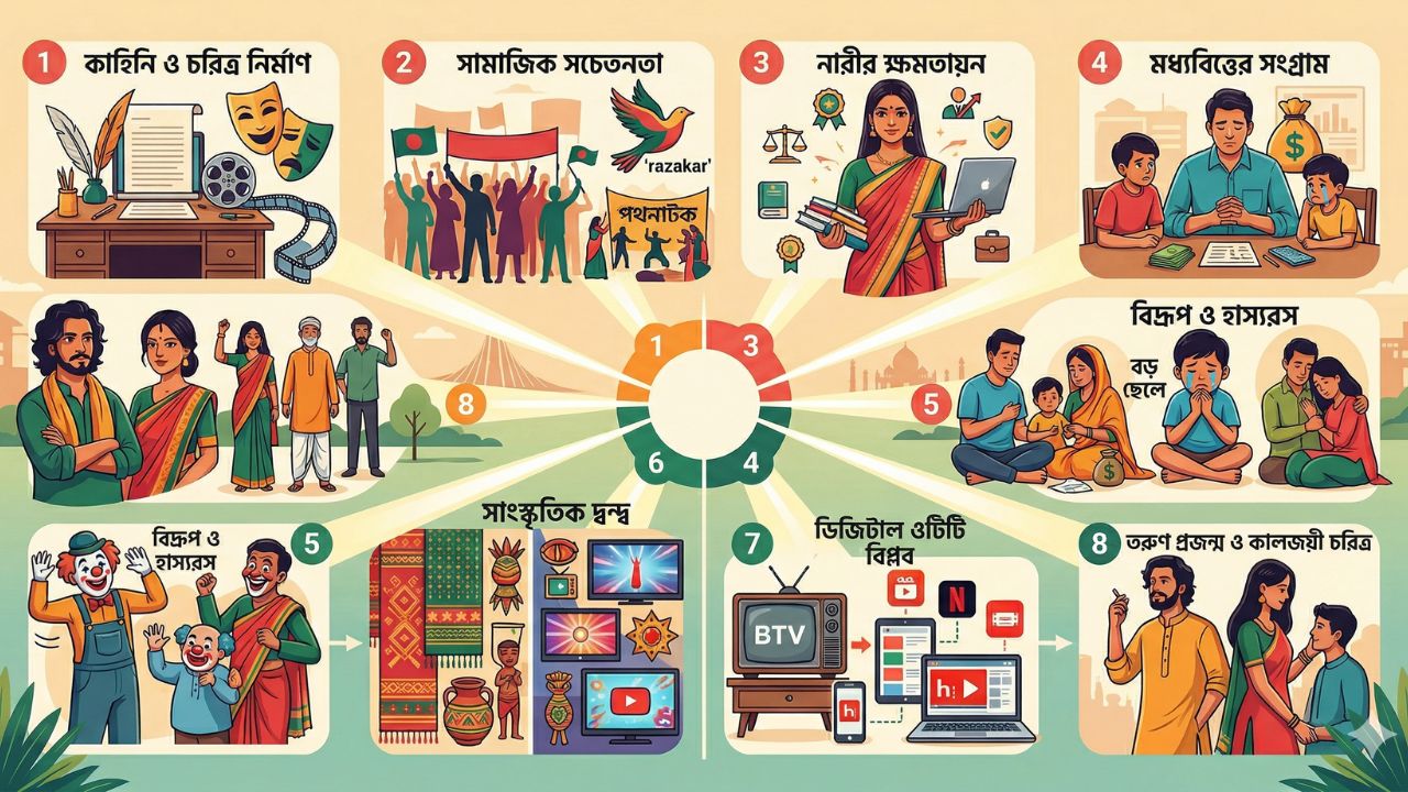 দর্শক যখন পর্দার চরিত্রগুলোর মাঝে নিজেদের আনন্দ, বেদনা, প্রাত্যহিক জীবনের সংগ্রাম এবং সাফল্য খুঁজে পান, তখন সেই শিল্পকর্মটি আর কেবল কাল্পনিক গল্পের মধ্যে সীমাবদ্ধ থাকে না; সেটি হয়ে ওঠে সমসাময়িক বাস্তবতার এক প্রামাণ্য দলিল। ঐতিহাসিক রাজনৈতিক প্রেক্ষাপট থেকে শুরু করে বর্তমান ডিজিটাল যুগের জটিল মনস্তত্ত্ব পর্যন্ত, সামাজিক সচেতনতা বৃদ্ধি, মনস্তাত্ত্বিক বিকাশ, নারীর ক্ষমতায়ন এবং সাংস্কৃতিক ঐতিহ্য রক্ষায় নাটকের অবদান অনস্বীকার্য। আজকের এই গবেষণাধর্মী আলোচনায় বাংলাদেশের নাটক থেকে শেখার মতো ৮টি বিষয় নিয়ে একটি বস্তুনিষ্ঠ, গভীর ও তাত্ত্বিক বিশ্লেষণ তুলে ধরা হলো, যা আমাদের ব্যক্তিজীবন, পারিবারিক কাঠামো এবং সামগ্রিক সমাজ গঠনে কী ধরনের প্রভাব ফেলে তা স্পষ্টভাবে তুলে ধরবে।