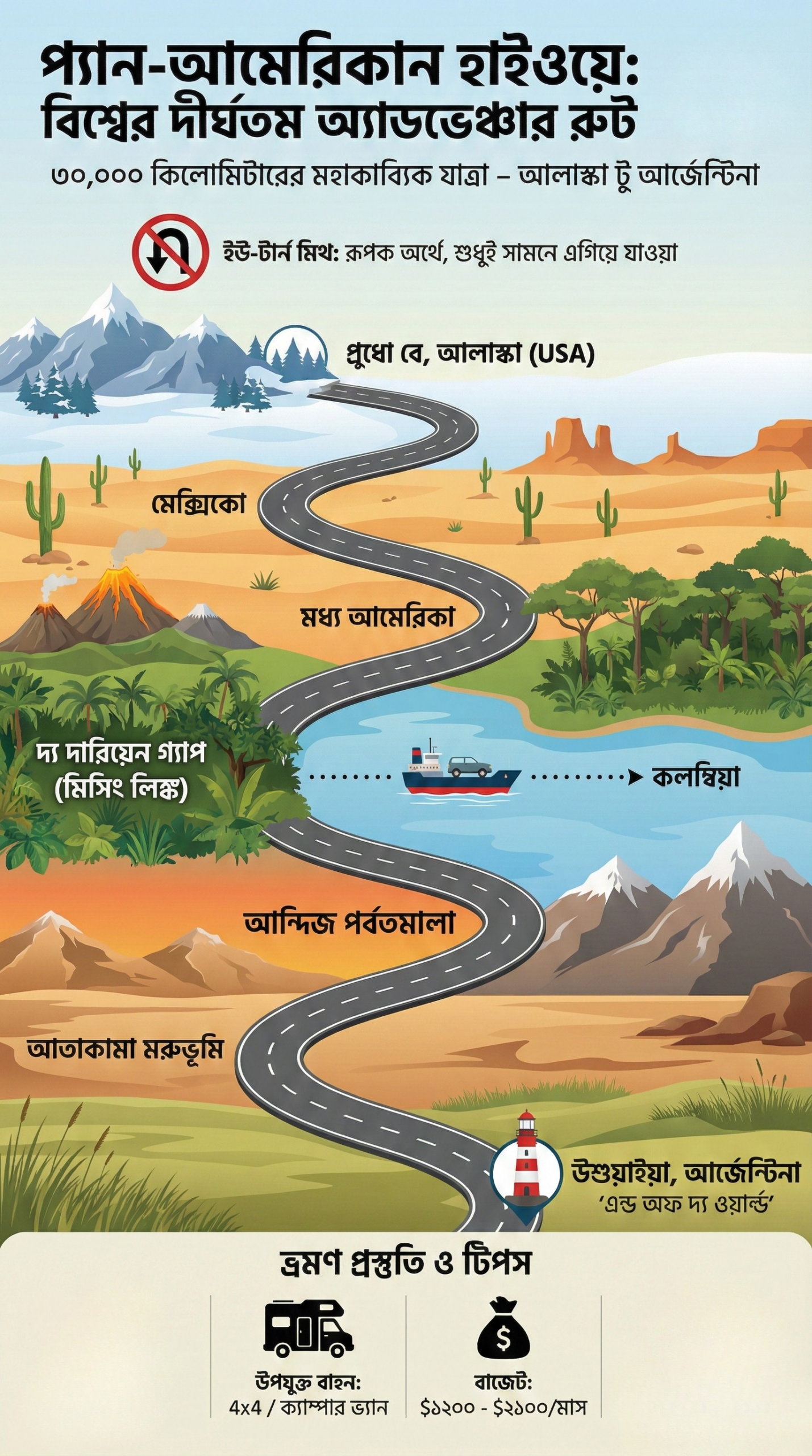 প্যান-আমেরিকান হাইওয়ে ভ্রমণের জন্য দীর্ঘমেয়াদী পরিকল্পনা প্রয়োজন। এটি কোনো এক সপ্তাহের ট্যুর নয়, বরং ৬ মাস থেকে ২ বছরের প্রজেক্ট।